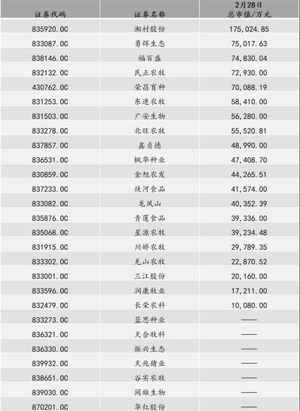 数据显示,除了7家企业无市值数据外,其它企业市值均上亿元,其中湘村股份市值最高,市值为17.50亿元。