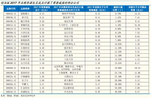 六、创业板中的三类公司2018年年报可能面临较大的商誉减值风险。1)明确在年报预告中披露了商誉减值风险或商誉减值准备计提情况的公司;2)截至18Q3商誉占净资产比值相对较高的公司;3)去年业绩承诺未完成且已经计提了商誉减值的公司,并且对该业绩承诺未完成的子公司所对应的商誉减值计提比例较低。