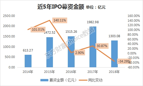 我们先来看看新股募资情况,东方财富Choice数据显示,2018年全年共有103只新股首发上市,较去年的421家,跌去近8成;首发实际募集资金1303.08亿元,较2017年的1982.98亿元,减少34.3%。