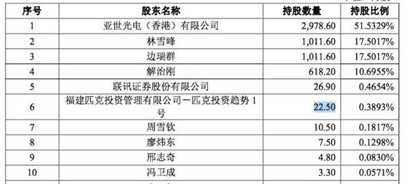 根据招股书显示,亚世光电在册股东共有151名,除去4位原始股东和3家证券公司,剩下的股东为17家机构/企业和127名个人。