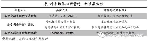 第三种是基于互联网大数据的统计。比如利用文本挖掘和情感分析算法处理Facebook、 Twitter等社交网站数据信息,或根据人们在如Google等网站上的搜索偏好来得到反映预期的指标。这一统计方式较为新颖,有着广阔的发展前景,但目前尚处于起步阶段,相关产品有待进一步成熟。