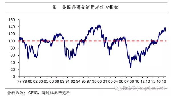信心指数中以消费者信心指数最为成熟,这一类指数通过对消费者的调查以反映其对宏观经济的乐观程度。如1967年开始公布的美国咨商会(the Conference Board)消费者信心指数,就被美联储作为调控利率水平时的参考指标,该指数编制即基于每月对5000户美国家庭的调查统计,取值范围在0-200之间,以100为中值水平,表明此时消费者信心为中立态度,高于100反映消费者情绪乐观,对前景有充分信心,反之则意味着信心不足。如从77年以来的指数表现上来看,目前美国消费者信心处于历史高位,然而回落态势已现。