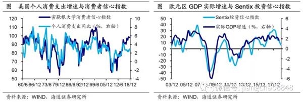 通常来说,信心指数与经济整体或其组成部分之间存在着高度相关性,甚至具备一定程度的领先性。比如美国另一个比较著名的消费者信心指数——密歇根消费者信心指数,其走势就与美国个人消费支出增速高度相关,而欧元区Sentix投资信心指数也与其GDP实际增速变化趋势基本一致。当然,信心指数和实际经济运行情况可能存在短期背离,特别是在经济处于转折期时,由于不确定性的加大,信心指数和实际经济运行情况的差距短期可能扩大,但持续时间不会太久。