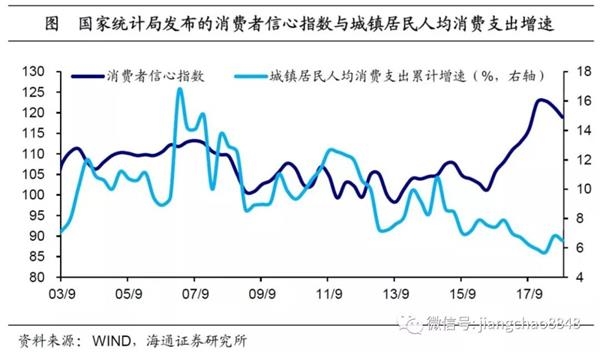 消费者信心指数与居民消费支出同样难以吻合。即便是考虑到包含服务消费在内的居民消费支出口径,16年末17年初以来,国家统计局发布的消费者信心指数同样与其走势难以吻合。消费者信心指数自16年2季度达到接近101的低点之后便一路上行,18年全年更是维持在历史高位的水平,但城镇居民消费性支出的累计增速却从16年2季度的超过7.5%降至17年的不足6%,18年虽略有好转,但三季度累计增速也仅6.5%。