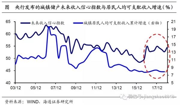 城镇储户对收入同样信心十足。在收入端,预期与现实的差距也在走扩。中国人民银行基于城镇储户调查而编制的未来收入信心指数显示,自16年四季度收入信心指数强劲回升,达到50%以上,其后一直维持在均值近54%的高位,最低时也未降低至52.5%以下。而城镇居民人均可支配收入增速近年来虽有起落,但17年增速最高时也仅8.3%,较14年之前9%以上的增速不可同日而语,较15年底也仅是微幅上升0.1个百分点,增速基本平稳,增长态势不强。