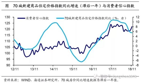 消费者信心来自房价高增。归根结底,消费者信心的高企还是同房地产有关。我们发现,我国的房价增速大约领先消费者信心指数三至四个季度。15年三季度70城房价同比增速降幅开始收窄,此后更是一路升至高位,而这也带动消费者信心指数在16年三季度左右开始触底回升,直至17年四季度达到本轮周期的顶点并维持高位。