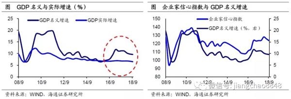 GDP名义与实际增速分化,企业家信心随名义增速走高。16年下半年以来,经济增长的一个显著变化即为GDP名义增速与实际增速的分化。15-16年初GDP名义增速与实际增速之间的差距均不足1个百分点,而恰恰是从16年三季度至四季度开始,GDP名义增速与实际增速开始出现明显分化,17年差距甚至拉大至超过4个百分点。而从企业家信心指数来看,其与GDP名义增速的走势更趋一致,在名义增速冲高的带动下,企业家信心也随之攀上高位。