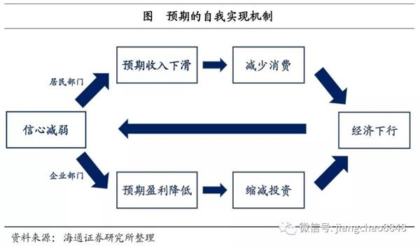 另一方面,更为重要的是,预期具有自我实现机制。如果市场主体对于宏观经济的信心减弱,那么,对于居民部门而言,他们预期自己未来的收入会有显著下滑,从而在当期就减少消费增加储蓄,以期为未来收入的下滑做好准备;对于企业部门而言,经营者会预期未来的企业盈利明显降低,从而缩减当期投资、增加资金储备加以应对。而消费和投资的回落使得经济在当期就会显著下行,并且进一步削弱市场主体的信心,形成相互强化的恶性循环。