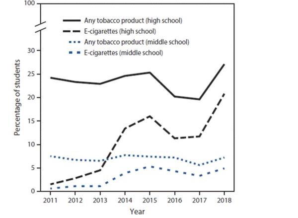 根据CDC(疾控中心)的数据(“Notes from the Field: Use of Electronic Cigarettes and Any Tobacco Product Among Middle and High School Students — United States, 2011–2018”),在高中和中学同学中,电子烟的使用比例经过了一个过山车一样的变化, 但总体向上,截止2018年,高中生中的使用比例达到20%左右,初中学生比例为5%。而在2011年,两者的比例都在1%左右。