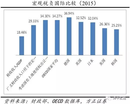 作为对比,经济合作与发展组织国家(OECD)平均的宏观税负在2015年为34.27%。这意味着,如果考虑进国有土地使用权出让收入,中国的“宏观税负”已经略高于发达国家平均水平。即便是29.33%这一不纳入国有土地使用权出让收入的“宏观税负”,也高于美国、韩国等国家。