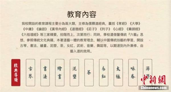在华夏学宫学校的官网上,文字一律采用繁体字,在教育内容一栏显示,开设的教育课程主要分为两大类,一类是《孝经》《大学》《中庸》等经典古籍,另一类就是中国传统技艺,包括古琴、书法、武术、女红等。