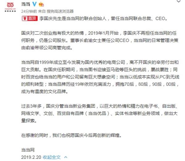 当当网官微2月20日宣布,联合创始人李国庆离开公司。当当网表示,2019年1月开始,李国庆不再担任当当网任何职务,仍是公司股东;董事长俞渝兼任公司CEO,当当网日常管理决策由俞渝带领公司高管完成。李国庆在总字数近2000字的公开信中表示,进入互联网中场赛事,再启程去追梦。他表示自己离开当当后,结束夫妻店治理结构,俞渝会带领公司洒脱地开创未来。