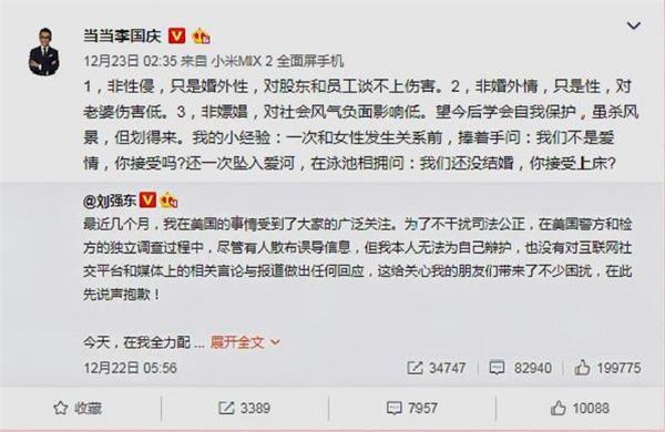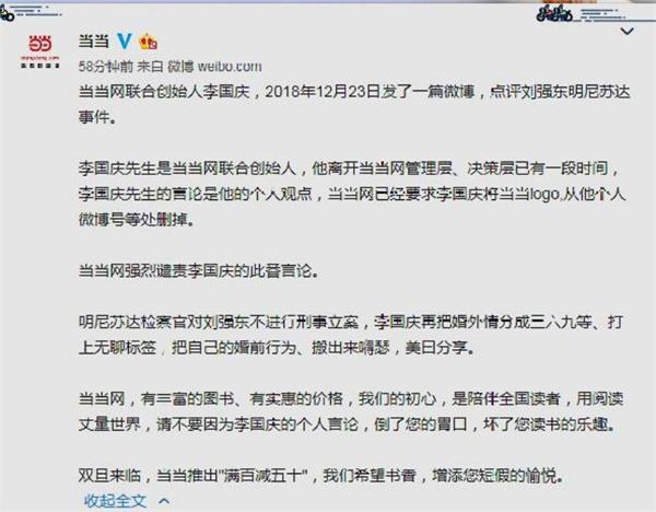 上一次当当官微和李国庆有直接交集是在2018年12月24日,也和刘强东有关。就在此前一天,京东创始人刘强东就不久前在美国涉嫌性侵事情在微博上道歉。李国庆转发并发表犀利评论,引起围观。