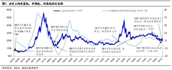 历史大底都很复杂,政策底领先市场底领先业绩底。1990年A股经历五轮牛熊周期,回顾前几次市场大底,除了2008年略偏V型,其他几次都是反复震荡筑底。早在前期报告《借鉴历史:政策底》市场底》业绩底-20181028》中我们曾分析过,市场真正的大底比较复杂,回顾05年以来,从时间上看政策底、市场底、业绩底依次出现的特征非常明显。05年1月财政部决定将证券交易印花税税率由2‰调整为1‰,05年2月1日上证综指1187点即为政策底,市场由此小幅反弹后回落,05年4月29日证监会启动股权分置改革,上市企业非流通股东支付一定对价给流通股东,以取得股票的流通权,这一举措消除流通与非流通股的长期制度差异,强化对上市公司约束机制。随后市场底出现,05年6月6日上证综指触底998点,A股开启了05/6-07/10新一轮牛市。这次业绩底则在06Q1出现,全部A股归母净利润累计同比从06Q1低点-14.0%升至07Q1高点80.7%。08年雷曼兄弟倒闭,次贷危机升级为全球金融危机,为对冲经济下行风险,08年9月15日央行宣布降息降准,存款准备金率下调1个百分点,1年期贷款基准利率下调0.27个百分点,08年9月18日上证综指1802点即为政策底。随着政策加码市场底开始出现,11月5日国务院常委会议宣布推出刺激经济的四万亿投资计划,10月28日上证综指触底1664点,结束了自07年10月以来熊市下跌,开启了08/10-09/08新一轮牛市。这次业绩底则在09Q1出现,全部A股归母净利润累计同比从09Q1低点-26.0%升至10Q1的61.4%。14年11月22日央行启动降息,政策底与市场底几乎重合,宽松流动性驱动水牛行情,上证综指最高涨至15年6月12日的5178点。15年6月-16年1月A股三轮大跌后,上证综指在16年1月27日、2月29日两次跌至2638点后开启了两年的大反弹,当时政策底与市场底基本重合,16年1月2.5万亿天量新增信贷投放,16年2月2日央行出台政策降低买房首付比例,16年2月19日财政部发文降低个人购买家庭住房契税。这次业绩底则在16Q2出现,全部A股归母净利润累计同比从16Q2低点-4.7%升至17Q4的18.1%。