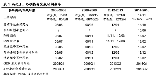 12年股指见底时,五大领先指标均率先企稳。11年12月央行降准、12年1月地产结构性放松,市场开启小幅反弹,12年1月6日上证综指2132点为政策底,之后再次探底,12年12月4日上证综指1949点为市场底,此后市场出现中级反弹,同日创业板指585点见底开启结构性牛市。当时的背景是随着12年11月十八大召开,市场对改革预期升温。在12年股指见底时,五大领先指标全部先后企稳。第一,贷款余额同比从12年1月最低的15.0%升至12年9月最高的16.3%;第二,汽车销量累计同比从12年1月最低-26.4%升至13年1月最高46.4%;第三,PMI、PMI新订单在11年11月探底,低至49.0、47.8,12年8月二次探底,分别为49.2、48.7,此后最高涨至13年10月的51.4、52.5;第四,基建投资累计同比从12年2月最低-2.4%升至13年4月最高25.6%;第五,商品房销售面积累计同比从12年2月最低-14.0%升至13年2月最高49.5%。