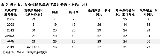 第二,19年1月PMI/PMI新订单继续回落。1月统计局PMI为49.5,较18年12月的49.4微升,分项看PMI新订单为49.6,较18年12月的49.7微降,二者仍位于枯荣线下,而且,1月财新PMI为48.3,较18年12月的49.7继续回落,可见PMI指标还未见底。目前PMI/PMI新订单已回落16个月,参考05年以来历史经验,PMI/PMI新订单从高点回落到低点需要20个月,目前均还未达到历史平均水平。