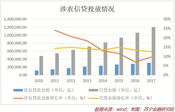 从上图涉农信贷投放情况来看,虽然近年来涉农信贷余额一直处于上升态势,但是增长率呈现梯度下降趋势,特别是2014年后,涉农贷款余额增长率一直低于信贷整体增长率,说明银行等传统金融机构对“三农”领域的贷款投放力度持续放缓,信贷资源在城乡之间处于失衡状态。