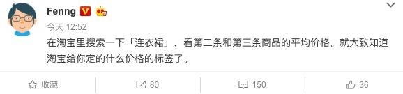 在大数据、AI当道的时代,这样以客单价为用户群体分类的行为,引起不少质疑,同时也让不少网友开始动员起来。在微博上,迅速掀起一波测评“晒图”浪潮。记者打开微博搜索连衣裙看到,大量的有网友晒出自己在淘宝搜索“连衣裙”的截图,均价从100多到3000多不等,不少晒图者还留言称“我果然是个贫民窟女孩”、“高客单价不是我本意”和“作为男生虽然我不买裙子,但淘宝还是给了我低端的印象。”同时,也有不少网友怀疑这是一场有预谋的营销,因为在搜索完连衣裙后,不发自拔地一头扎进淘宝逛了一个小时。