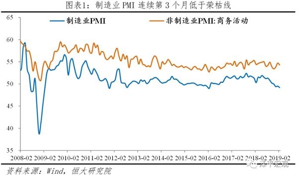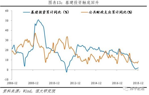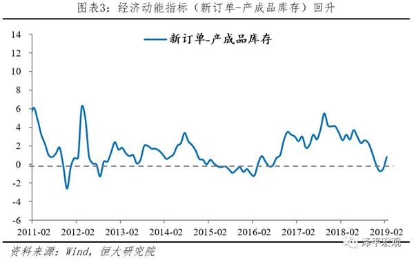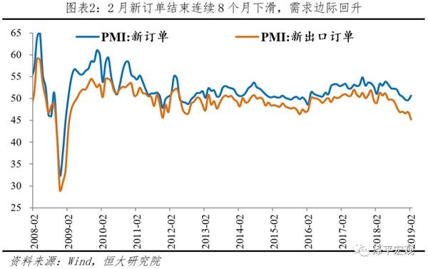 库存周期对经济的短期波动影响较大,2017年3季度-2019年上半年处于库存周期的去库存阶段,预计持续至2019年中,对经济拖累缓解,是经济触底的重要原因。2月PMI反映生产和原材料采购放缓、库存下降,但新订单、价格和生产经营活动预期上升,预示主动去库存或进入尾声;新出口订单和进口指数均创2009年以来新低,表明内需强于外需,且需求的回暖主要是非贸易部门,主要是基建在积极财政和宽货币宽信用下发力。