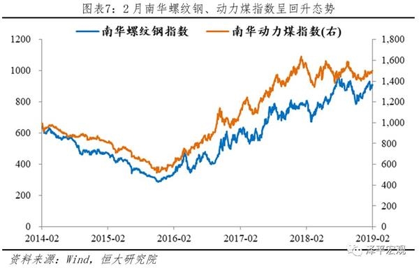 2月PMI价格指数受原油和煤钢等工业品价格上涨带动回升,原材料购进价格指数重回荣枯线上方。2月PMI主要原材料购进价格指数和出厂价格指数分别为51.9%和48.5%,较上月分别回升5.6和4.0个百分点,原材料价格已重回荣枯线上方。本月布伦特原油环比上涨9.5%,同比下降2.3%,较1月收窄6.1个百分点;南华工业品指数环比上涨3.8%,同比上涨4.5%。从行业看,石油加工、化学原料和化学制品、黑色金属冶炼及压延加工等行业的主要原材料购进价格指数和出厂价格指数环比上升幅度较大。