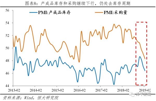 企业主动去库存仍在持续,但需求边际好转,去库存进入尾声。2月原材料库存、产成品库存指数和采购量指数分别为46.3%、46.4%和48.3%,分别较上月下滑1.8、0.7和0.8个百分点。企业采购、生产下行,需求上行,库存下降。当企业面临需求和价格的持续上行,将改变生产经营预期,并增加原材料采购和生产,去库存进入尾声向补库存过渡,此时经济触底并走向企稳,预计发生在2-3季度。