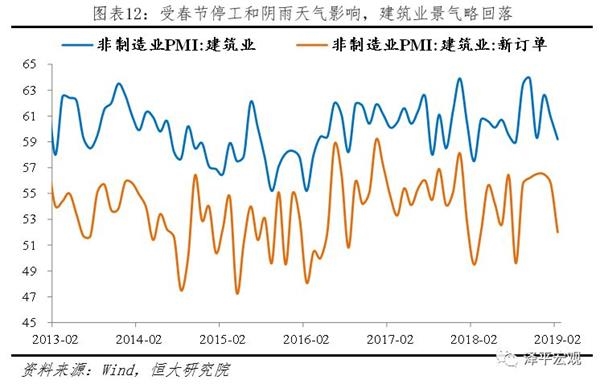 非制造业商务活动和建筑业景气受节日停工与天气影响略有回调,但整体好于去年。非制造业商务活动指数为54.3%,比上月回落0.4个百分点,去年同期回落0.9个百分点;新订单指数50.7%,较上月回落0.3个百分点,去年同期回落1.4个百分点。其中,受春节企业停工和南方阴雨天气影响,建筑业景气度有所回落,但仍处高位。2月建筑业商务活动指数为59.2%,较上月回落1.7个百分点,去年同期回落3.0个百分点;新订单指数为52.0%,较上月回落3.8个百分点,去年同期回落3.3个百分点。从市场预期看,建筑业业务活动预期指数为66.7%,比上月和上年同期分别上升2.2和1.0个百分点,继续位于高位景气区间,表明随着气候转暖和基建补短板,建筑业有望继续保持快速发展。