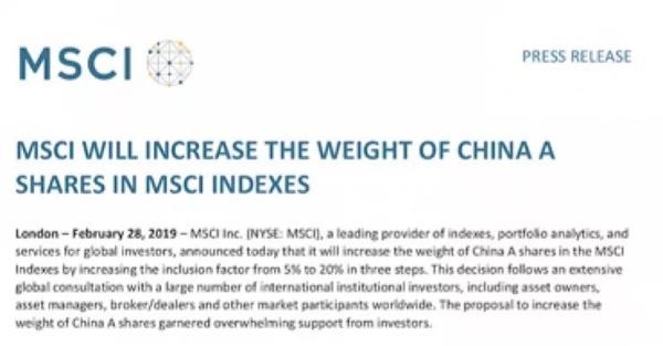 北京时间3月1日6时,国际知名指数编制公司MSCI(明晟)正式宣布,未来将中国大盘A股的纳入因子从现有的5%提升到20%。