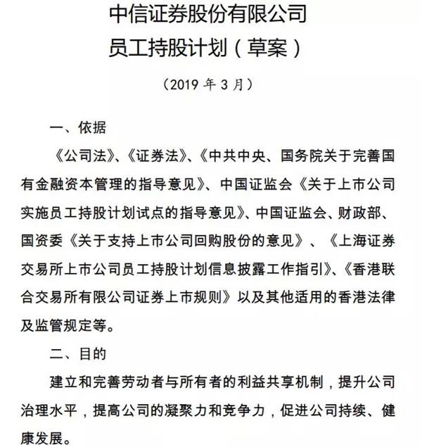 草案显示,中信证券拟推行员工持股计划,资金来源为公司应付员工的合法薪酬,由信托机构直接在二级市场购买公司A股或H股股票,累计不超过公司股份总数的 10%。本次员工持股计划的有效期为10年,分年实施。
