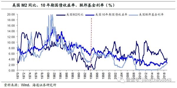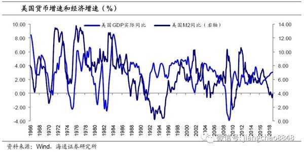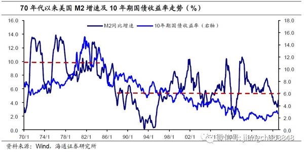 而从长期来看,利率和货币增速的趋势更像是一致的。以80年代中期为界对比可以发现,利率的趋势与货币增长的中枢有关:货币增速高、利率趋升,货币增速低、利率趋降。70年代到80年代早期,美国货币增速水平在10%左右的高位,10年期国债的利率从6%左右上行到接近15%,而在80年代以来,货币增速中枢大幅降低到5%左右,近30年间10年美债收益率也由8%降至2%附近。90年代末以来,虽然M2增速波动放大,但利率仍延续了走低的趋势。