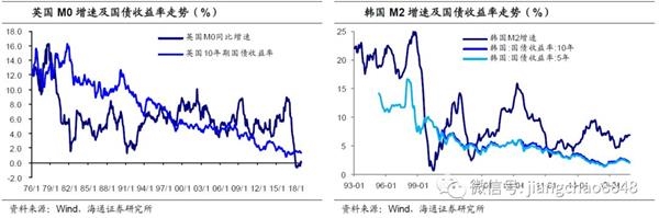 这背后的原因在于,此时货币增速主要代表需求,而长期来看货币增长的水平其实应和利率大致匹配。货币增速近似可以理解为存量货币增值的速度,在一个稳态的经济环境中,存量货币价值增长的速度应当与全社会的平均回报率相一致,而全社会的回报水平可以基于利率水平来衡量。因此,长期而言,高增长的货币对应较高的社会平均回报率和高利率,而低增长的货币则对应回报率的降低和较低的利率,美、英、韩等国在90年代之后其实都处在这一状态。