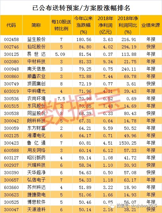 数据宝统计显示,截至目前,已有101股披露2018年度送转方案或预案,送转比例最高的是裕同科技,公司3月12日晚间公告年报拟10转12派6元。在公布送转预案的次日,裕同科技一字板涨停。根据裕同科技此前披露的2018年度业绩快报,公司去年净利润为9.45亿元,同比增长1.38%。