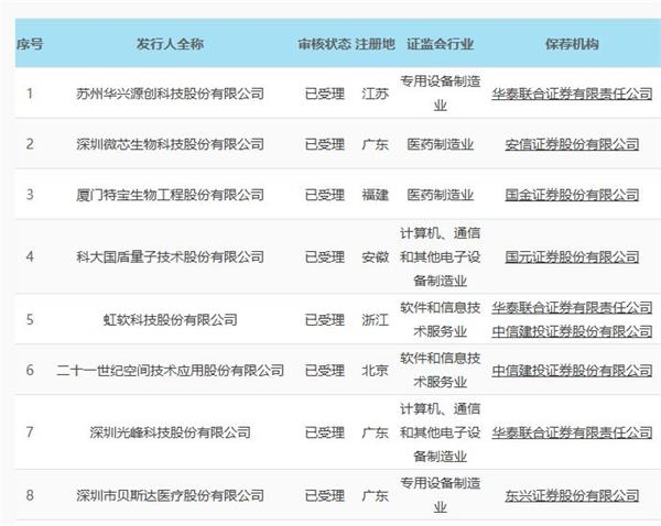 3月27日晚,上交所科创板股票发行上市审核平台披露信息显示,当日有8家企业已获得受理,包括华兴源创、微芯生物、特宝生物、二十一世纪空间技术、虹软科技、光峰科技、贝斯达、科大国盾。