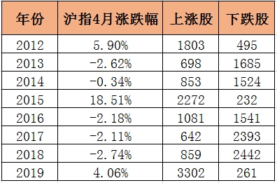 火山君梳理历史数据发现,从2012年以来,沪指4月的表现大多不好,见下表: