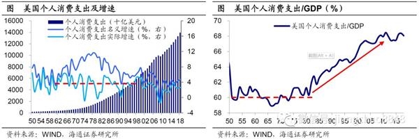 消费强劲背后:人口收入主推,减税信贷助力。美国消费持续走强,驱动力主要来自五个方面。一是年轻人口高增,奠定消费基础。二战后,美国先后迎来婴儿潮、回声潮,不仅令其人口总量快速增长,也导致人口年龄结构明显优化。加之女性崛起并成为劳动力市场的中坚力量、移民涌入补充劳动力,美国的劳动参与率和就业率双双提升,为消费需求扩张、消费结构调整奠定了扎实的数量基础。二是收入稳定增长,消费持续升级。二战后,美国经济稳健增长,收入分配向劳动报酬倾斜,因而“人均GDP-人均收入-人均消费支出”传导得以顺畅进行。收入水平的提升,不仅令消费稳健增长,也推动了从传统消费到新兴消费、从物质消费到服务消费的升级。三是减税改善收入,提振消费能力。美国居民消费率显著上升始于80年代。而80年代最大的变化在于政策主线从刺激需求转向改善供给,最典型的是里根政府实施的两次大规模减税。减税本质上是政府让利于民,通过改善居民收入来提振居民消费支出,从而拉动经济。历史上,三轮减税都起到了很好的效果。四是消费信贷扩张,提升消费杠杆。而80年代另一大变化来自于消费信贷、消费金融的大发展。70年代的大滞胀令居民从储蓄转向消费,得益于减税带来的收入改善,美国消费金融产品的创新,以及不断完善的消费信贷法律体系,美国消费信贷规模从1950年底的200亿美元激增至1980年底的3500亿美元,占社会消费品零售总额的比重也从90年代初的40%升至目前的60%以上。但这势必也带来居民债务的明显上升,80年代后期、00年代初期美国家庭负债比率两轮上升,均由消费贷款扩张驱动。五是技术创新浪潮,降低消费成本。技术进步导致部分商品、服务价格降低,不仅带来消费结构的变化,也令消费方式发生转变。技术进步使得电子产品价格持续走低,令个人电脑和手机得到普及,也带动了相关商品、服务消费的大幅增长。而随着互联网服务以及电子设备的普及,电子商务这种新的购物方式也逐渐得到认可。