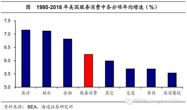 医疗服务需求旺盛,娱乐、金融拉动增长。具体来看,在各项服务消费中,医疗服务消费需求增长最为迅猛,1980-2018年,居民全部服务消费支出年均增速6.2%,而医疗服务消费支出年均增长7.2%,高出服务消费整体增速1个百分点左右。此外,娱乐服务、金融服务支出在这一期间也都有较快的增长,拉动服务消费占比持续提升,而相对来看,居住和住宿餐饮类消费支出增长较为缓慢。