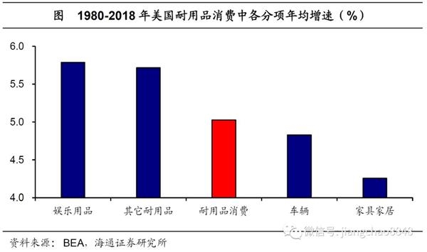 娱乐用品快速增长,汽车、家居明显拖累。在耐用品消费中,和娱乐服务紧密联系的娱乐用品消费增长速度较快,其1980-2018年间的年均增速达到5.8%,较整体耐用品消费的年均增速要高0.8个百分点左右,而紧随其后的是包含手表珠宝、医疗设备、和通信工具等其它耐用品消费项目。这一时期汽车和家居类消费在耐用品消费中的增长速度尤为缓慢,对耐用品消费的增长形成明显拖累,两者年均增速均不足5%。