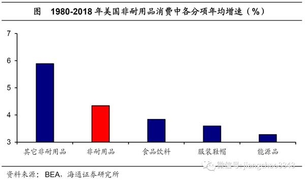 非耐用品多数下滑,药品、个人护理等商品占优。在非耐用消费品中,传统的食品、衣着类消费增长尤为缓慢,1980-2018年间两者年均增速均不足4%,包含汽油等在内的能源品消费增速同样不高。而在非耐用品消费增长普遍下滑的背景之下,药品、玩具和宠物用品和个人护理用品等其它非耐用品类实现了较为快速的增长,其在这一时期年均增速近6%,甚至快于耐用品消费的增长速度。