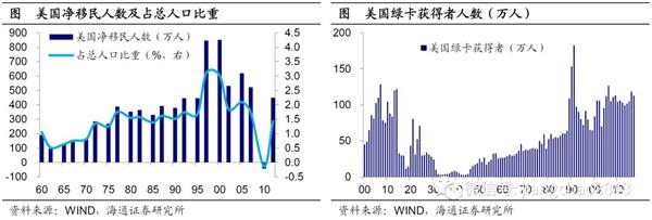 移民持续涌入,占比逐年提升。此外,移民人口的持续增加,也对美国总人口形成补充。净移民人数从62年的96万人持续上升至97年的847万人,占总人口的比重从0.5%上升至3.1%。绿卡获得者数量也从46年的11万人上升至91年的183万人。两者均在90年代达到峰值。