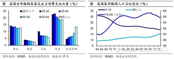 人口年龄结构的改变使得消费结构随之调整,表现为美国医疗类消费支出的大幅增长,另外,其对汽车以及食品服装等消费占比下滑也具有一定的解释力。