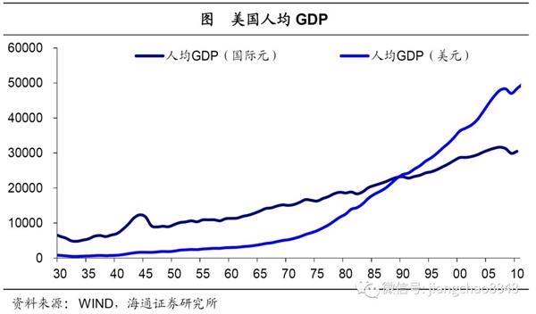 人均GDP加速上行,率先步入高收入。二战后至今,美国经济整体保持稳健增长,率先步入高收入经济体。1951年,美国人均GDP分别突破2000美元、10000国际元大关,并在70年代后期加速上行,到2000年已分别升至36305美元、28702国际元,年均增速高达6%、2.2%。