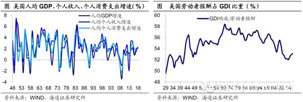 从人均GDP到人均收入和消费支出。人均GDP和收入分配共同决定了人均收入,人均收入和边际消费倾向又共同决定了人均消费,因而人均GDP增速、人均收入增速和人均消费支出增速基本保持同步。从收入法看,美国劳动者报酬占国内总收入(GDI)比重在50-70年间持续上升,在70-90年间高位企稳,在90年代之后震荡下行。收入分配向劳动报酬倾斜,也是居民消费率持续上升的重要原因之一。