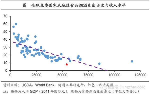 收入水平大幅提升,必需消费支出下降。早在19世纪恩格尔就已发现,随着国家收入水平的提升,食物类支出在消费支出中的占比持续下降(即恩格尔定律),全球各国的发展情况与这一规律也大体吻合。而从80年代以来,美国居民的收入水平经历了较大幅度的提升,在人口总量保持增长的背景下,18年的人均实际可支配收入约是80年的2倍,年均增速也接近2%。