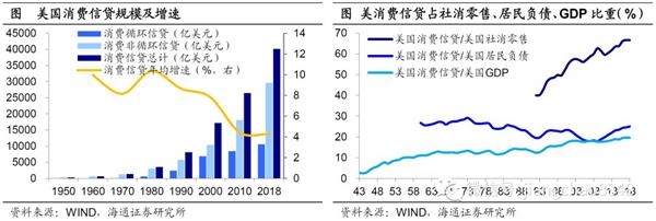 消费信贷规模激增,占社消比重逐年攀升。美国消费信贷在20世纪70、80年代迎来高速增长期,总体规模从1950年的200亿美元左右,激增至1980年的3500亿美元。消费信贷占美国社消零售的比重持续上升,90年代约在40%左右,目前已超过60%;占GDP的比重也从80年代初的10%左右,上升到目前的20%左右;占居民负债的比重也始终保持在20%以上,最高曾到过30%。