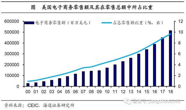 购物方式转变,电商渐获认可。技术进步不仅带来了消费结构的变化,也使得人们的购物方式发生了转变,随着互联网服务以及电子设备的普及,电子商务这种新的购物方式逐渐获得认可。2000年初,美国电子商务零售额仅有不足300亿美元,占零售总额比重也只有不足1%,而2018年,全美国电子商务零售额已经超过5000亿美元,年均增速接近18%,占零售总额比重也已在10%左右。