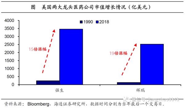 医药公司做大做强,龙头突破千亿美元。人口年龄结构的转变以及收入水平的提高,使得人们对医疗相关消费需求大幅增长,相应地带动了医药公司规模的迅猛扩张,在资本市场上,龙头公司的市值也迭创新高。90年至18年期间,美国两大龙头医药公司强生和辉瑞市值规模的涨幅均超过15倍,而18年仅美国强生公司一家的市值规模就超过我国A股所有医药类上市公司市值的总和。