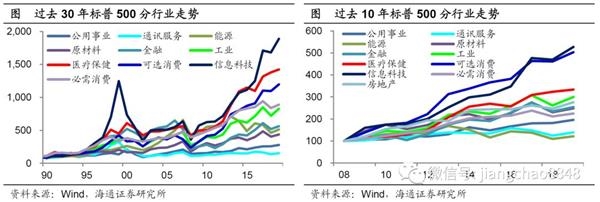 资本市场反馈:成长消费领跑,强于周期金融。资本市场提供了重要的反馈机制,股票市场在长期是称重器,消费领域的优质公司,由于盈利稳健增长、屡创新高,其市值在长期也都显著上升。比如,医药领域的龙头公司强生,市值从90年底的239亿美元,上升到18年底的3461亿美元,涨幅19倍;再比如,必需消费领域的龙头公司可口可乐,市值从81年的43亿美元,增长到18年的2015亿美元,涨幅47倍。而回顾90年以来标普500各行业涨幅,与高端消费和创新相关的信息科技、医疗保健分别以18.9倍、14.2倍领跑,可选消费和必需消费以12倍和8.9倍紧随其后,表现均远好于与工业投资相关的工业、能源、原材料,也强于金融、地产。而观察过去十年各行业表现,信息科技、可选消费、医疗保健依然领跑。