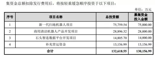 此次石头科技拟发行不超过1666.6667万股,拟募资13亿左右,投入到新一代扫地机器人项目、商用清洁机器人产品开发项目、石头智连数据平台开发项目和补充营运资金。