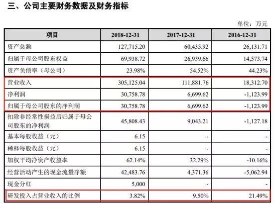 从公司财务数据看,2016年-2018年的营业收入分别为1.83亿、11.19亿、30.51亿,归母净利润从2016年亏损1123.99万到2017年盈利6699.62万,2018年盈利大幅增至3.08亿。公司表示十分重视技术创新在企业发展过程中的作用,对于研发的投入逐年增加。
