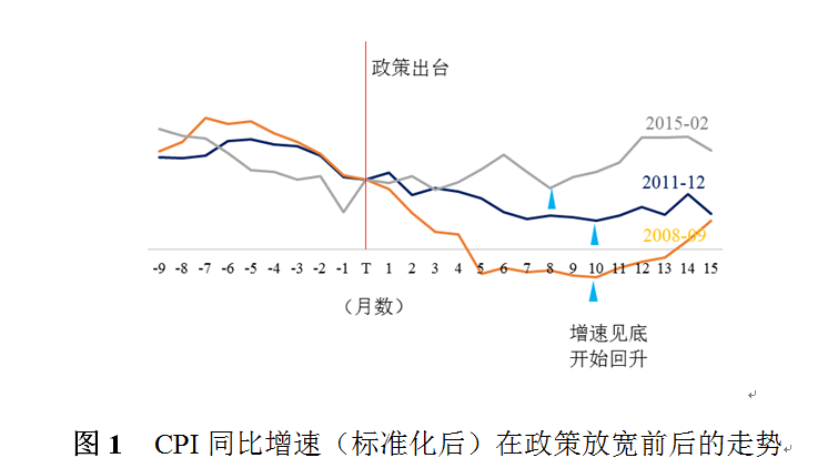 注:以政策开始宽松月份的CPI同比增速为基准(e.g.2008年9月CPI同比增速=100),将宽松政策出台(红色竖线)前后月份的CPI增速进行标准化处理,可见蓝色小箭头所指月份的CPI增速开始企稳回升,那么政策时滞分别为11个月(起始于2008年9月的政策宽松)、11个月(起始于2011年12月的政策宽松)、9个月(起始于2015年2月的政策宽松)。