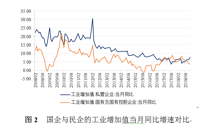 四是民营经济的波动。民营经济是整个经济体系中的重要组成部分,具有“56789”的特征,即贡献了50%以上的税收,60%以上的GDP,70%以上的技术创新,80%以上的城镇劳动就业,90%以上的新增就业和企业数量。2016-2018年,民营经济对我国经济增长的贡献率有所降低。以工业增加值为例,长期以来民营企业的增加值当月同比增速高于国企。2016年下半年以来,民营企业的增加值增速出现较为明显下滑,而国企的增加值增速则触底回升,2016年年底上升至6.4%,超过民营企业增速约1.2个百分点,并一直持续到2018年7月。随着支持民营经济的各项政策密集出台,民营企业的增加值同比增速从2018年8月起稳步回升。2019年1-2月,国企的工业增加值累计同比增速降至4.4%,而民营企业的增加值增速上升至8.3%。
